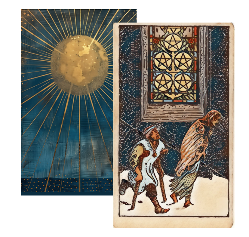 Although both can involve loss, their nature is very different. The 5 of Pentacles is about circumstances beyond your control— hardship that often feels imposed or unexpected. The 8 of Cups, however, is a choice— a conscious decision to walk away from something unfulfilling. One is about enduring and navigating tough conditions; the other is about seeking deeper purpose.