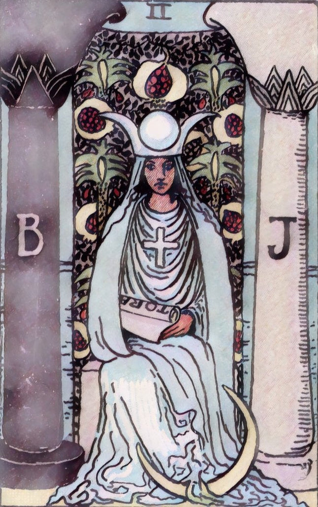 Upright: Spiritual guidance, self-development, traditions, religion, mentor, church. Reversed: Unconventional, rejecting traditions, rebellion